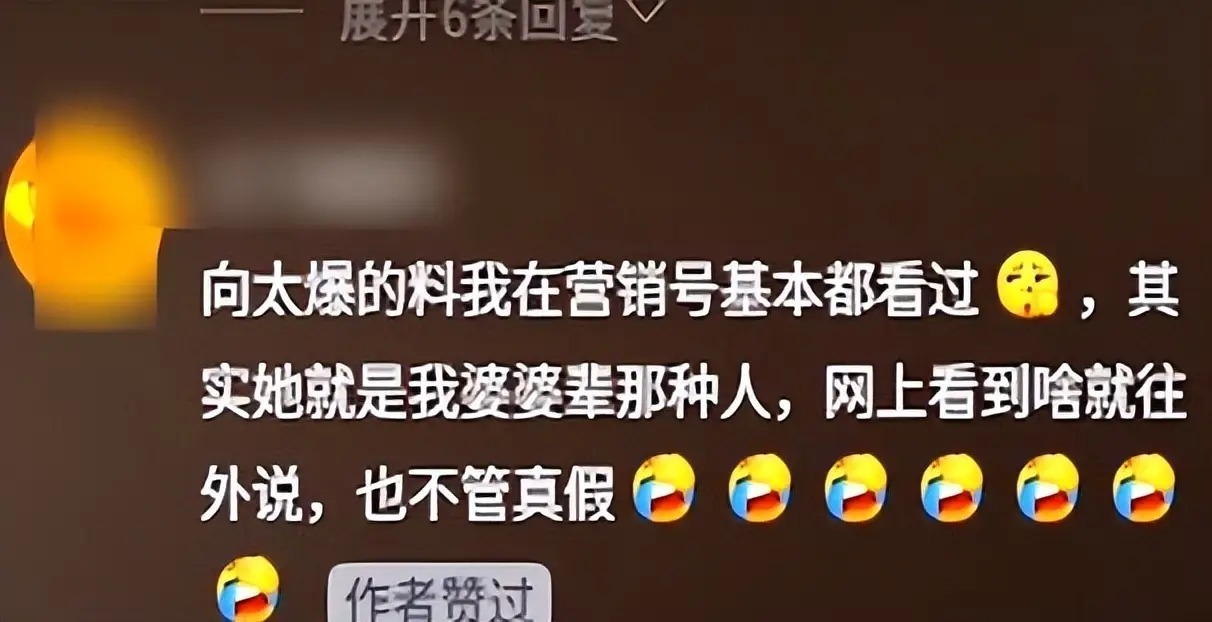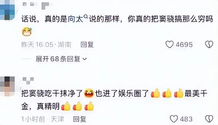 不过这瓜吃着吃着,风向却转了。本来大家还在讨论窦骁和何超莲,结果火力不知怎的,就集中到了向太身上。这事还得从向太那次若有所指的爆料说起。