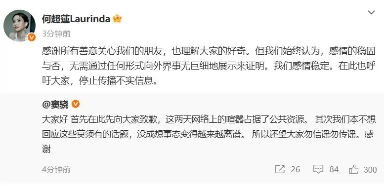 窦骁和何超莲一前一后在社交平台发文,明明白白地澄清:离婚?假的!我们好着呢!这一下,不少感觉自己被误导的网友,转头就冲进了向太的评论区。