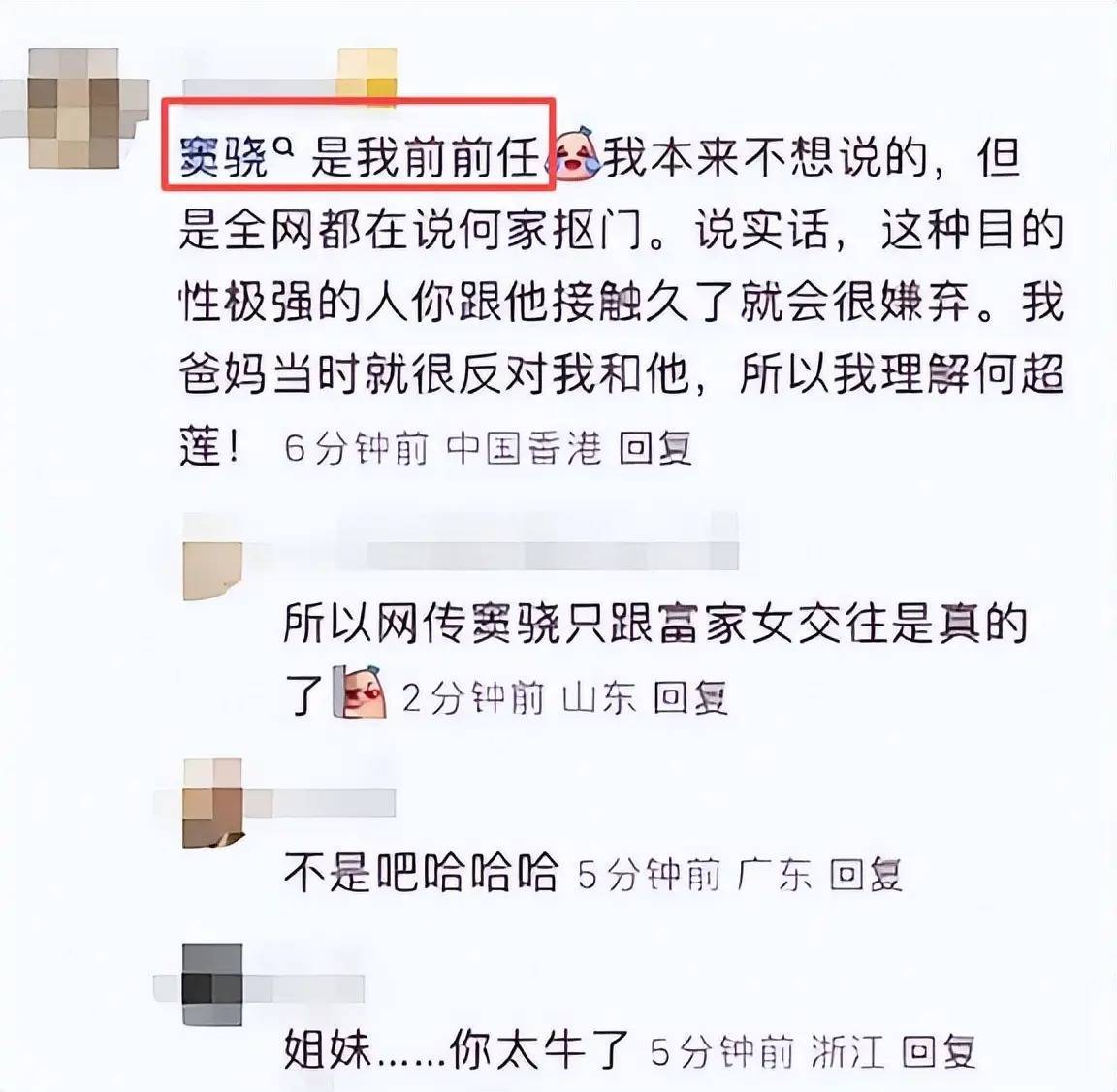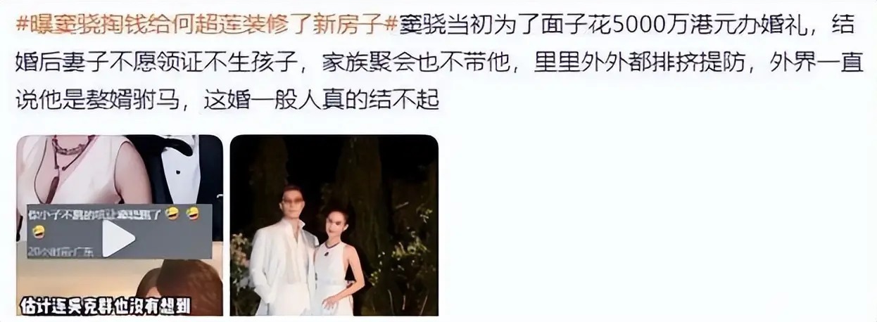 更夸张的说法接着来了:什么婚礼钱是窦骁一个人出的,女方不支持;结婚后女方不肯领证、不愿生孩子;甚至说这段婚姻本身就是何超莲为了进娱乐圈而设的“局”,是场“豪门杀猪盘”。