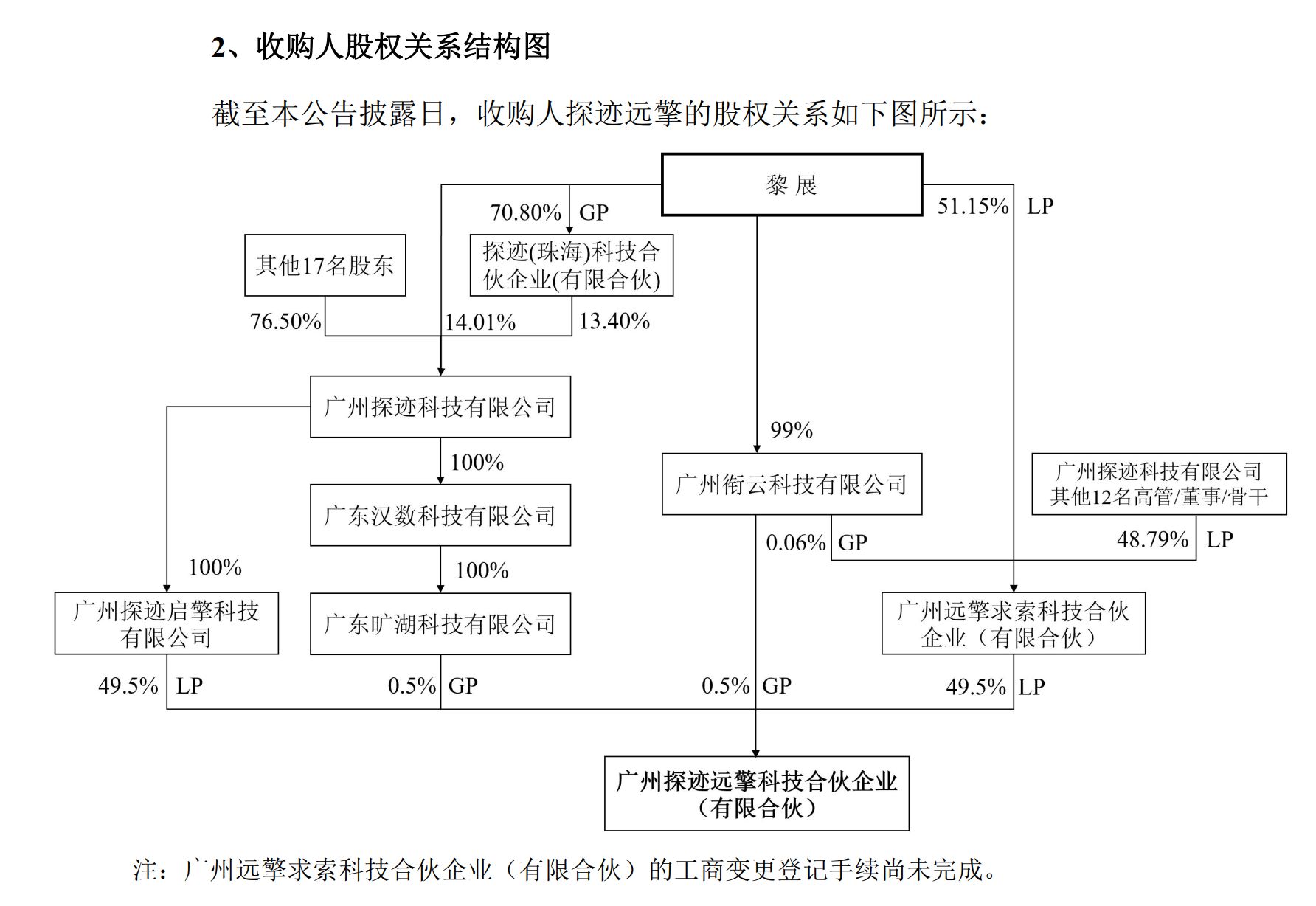 根据公告中的股权关系结构图,黎展通过多层合伙企业及公司架构,最终实现了对收购方探迹远擎的控制。