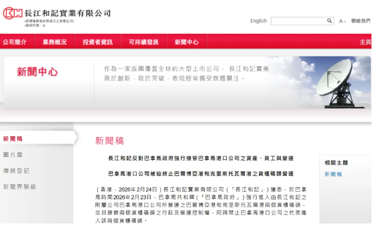 2026年2月24日,李嘉诚旗下长和在官网发布公告称,长江和记反对巴拿马政府强行接管巴拿马港口公司之资产、员工与运营,巴拿马港口公司被迫终止巴尔博亚港和克里斯托瓦尔港之集装箱码头运。