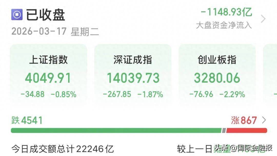3月17日,A股市场延续调整,主要股指震荡收跌。截至收盘,两市超4500只个股下跌,日成交额降至2.22万亿元。市场热点主线不清晰,呈现快速轮动态势。