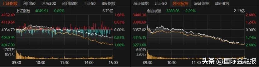 上午A股表现尚可,午后一路走低,指数跌幅扩大,双创指数跌幅均超2%。沪指收跌0.85%报4049.91点,创业板指收跌2.29%报3280.06点,深证成指收跌1.87%。科创50、北证50均跌约2%,沪深300跌近1%,上证50微红。
